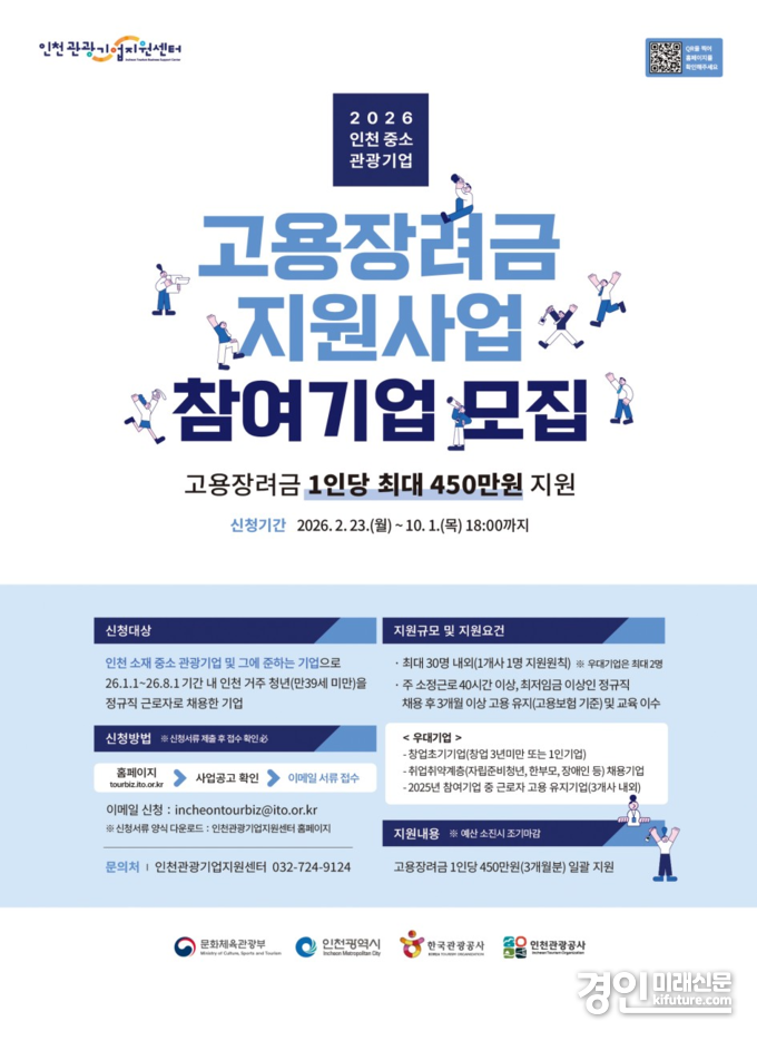 (경인미래신문=민경호 기자) 인천광역시(시장 유정복)와 인천관광공사(사장 유지상)는 지역 중·소 관광기업의 안정적인 인력 운영을 지원하고 인천 거주 청년의 지속 가능한 일자리 창출을 위해 ‘인천 중·소 관광기업 고용장려금 지원사업’을 추진한다고 밝혔다.