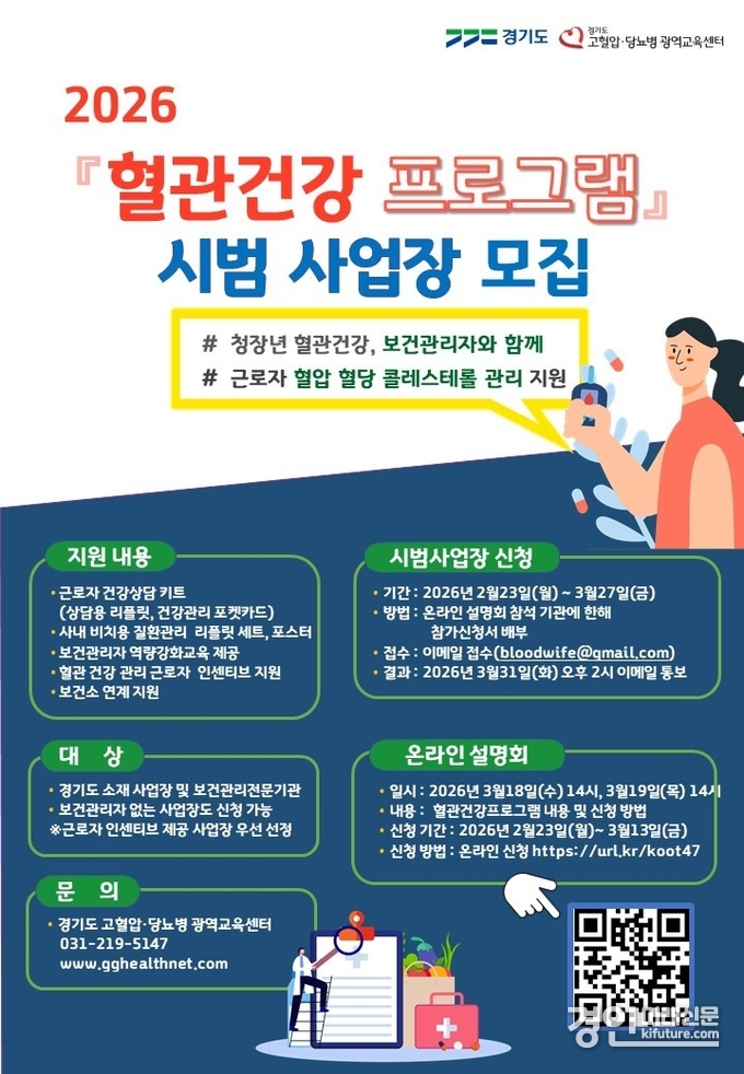 (경인미래신문=민경호 기자) 경기도가 올해 650개 사업장 근로자를 대상으로 ‘혈관건강 프로그램’을 운영한다며 3월 27일까지 사업장을 모집한다.