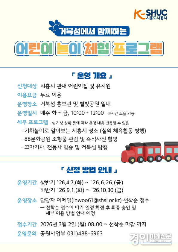 (경인미래신문=민경호 기자) 시흥도시공사(사장 유병욱, 이하 공사)는 오는 4월부터 거북섬 일대에서 관내 어린이집 및 유치원을 대상으로 ‘거북섬과 함께하는 어린이 놀이 체험 프로그램’을 운영한다고 밝혔다.
