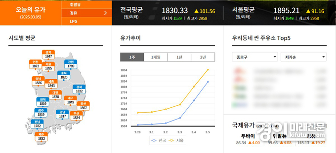 (경인미래신문=민경호 기자) 미국과 이스라엘의 이란 공격 여파로 국제 유가가 급등하면서 국내 기름값이 일주일 만에 가파르게 상승했다.