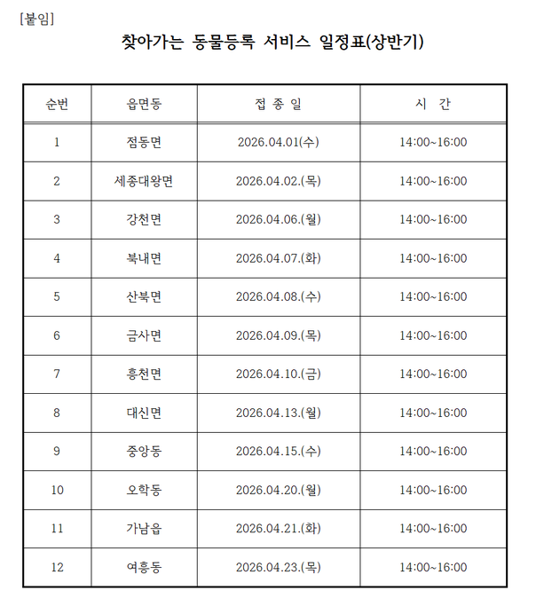 이번 서비스는 춘계 광견병 예방접종 기간에 맞춰 진행되며, 읍·면·동별 지정된 운영 일정(별첨)에 따라 행정복지센터 접수 창구를 방문해 신청서를 작성하면 된다.