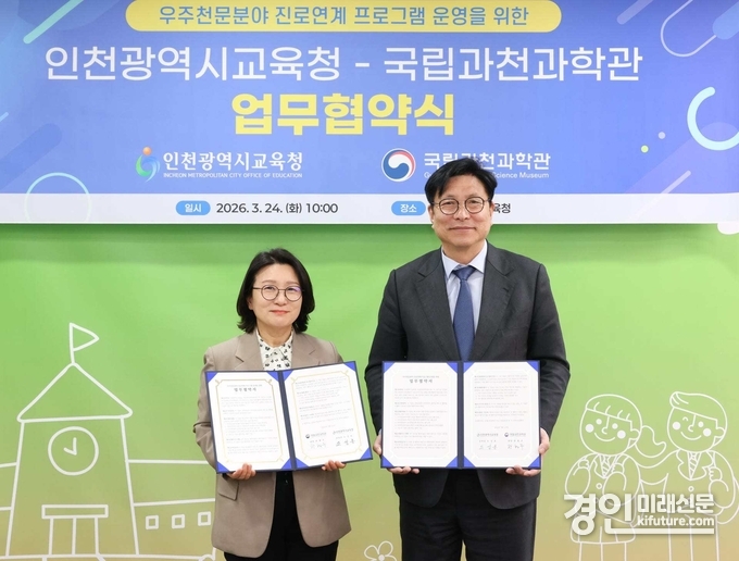 (경인미래신문=민경호 기자) 인천광역시교육청(교육감 도성훈)은 24일 국립과천과학관(관장 한형주)과 우주천문 분야 진로연계 프로그램 운영을 위한 업무협약을 체결하고 미래 우주 시대를 이끌어갈 창의적인 인재 양성에 나섰다.