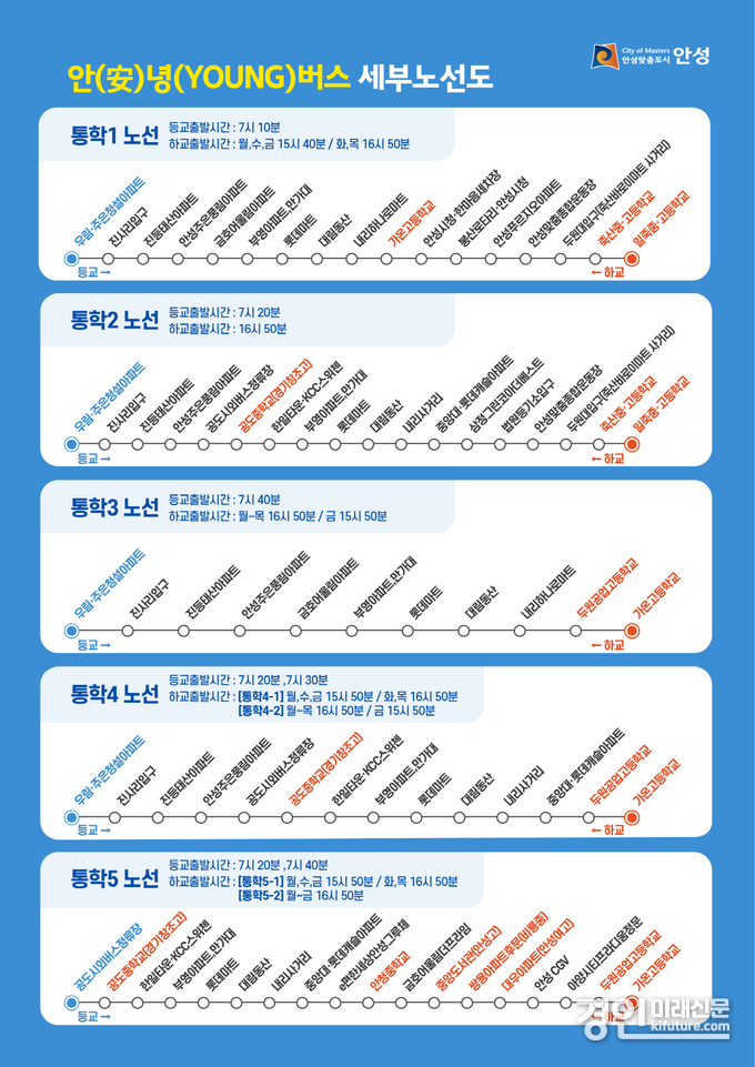 (경인미래신문=민경호 기자) 안성시는 대중교통 이용이 불편한 지역 중·고등학생들의 안전하고 편리한 등·하교 환경 조성을 위해 학생전용 통학버스 ‘안(安)녕(YOUNG)버스’를 오는 30일부터 본격 운행한다고 밝혔다.