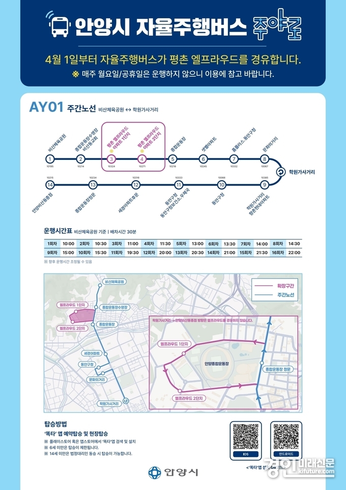 운행 노선도 일부 연장됐다. ‘주야로’는 평촌엘프라우드 아파트를 새롭게 경유해 1단지와 2단지에 각각 정차한다.