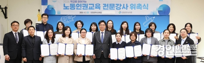 (경인미래신문=민경호 기자) 인천광역시교육청(교육감 도성훈)은 2일 학생들이 노동의 가치를 배우고 인권 감수성을 함양할 수 있도록 돕는 ‘2026학년도 학교로 찾아가는 노동인권교육 전문강사단’ 위촉식을 개최했다.