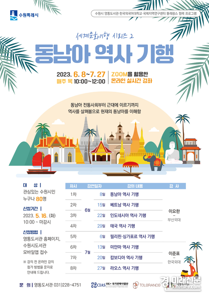 (경인미래신문=민경호 기자) 수원시 영통도서관이 한국외국어대학교와 협력해 운영하는 강좌 ‘동남아 역사 기행’ 참가자를 선착순으로 모집한다.