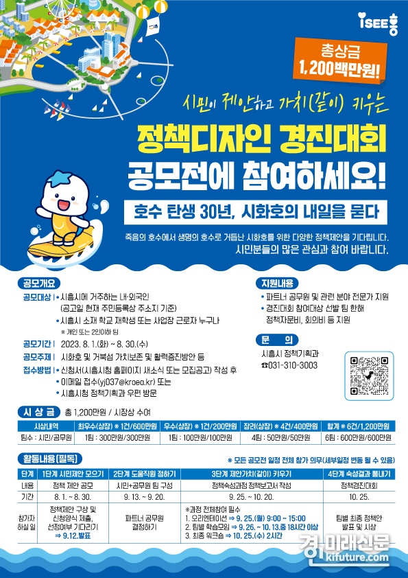 (경인미래신문=민경호 기자) 시흥시(시장 임병택)는 2024년 시화호 방조제 준공 30주년을 맞아 ‘생명의 호수로 다시 태어난 시화호를 위하여’라는 주제로 진행되는 ‘시화호 정책디자인 경진대회’ 공모전 참여자를 모집한다.