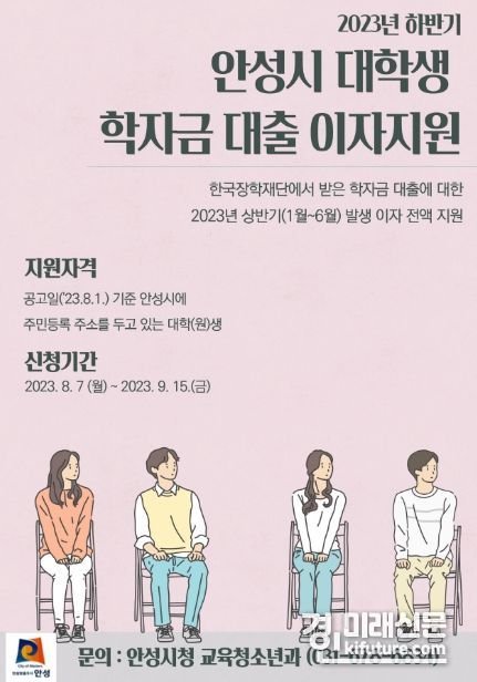 (경인미래신문=민경호 기자) 안성시는 오는 7일부터 9월 15일까지 ‘2023년도 하반기 안성시 대학생 학자금 대출이자’ 지원 신청을 받는다.