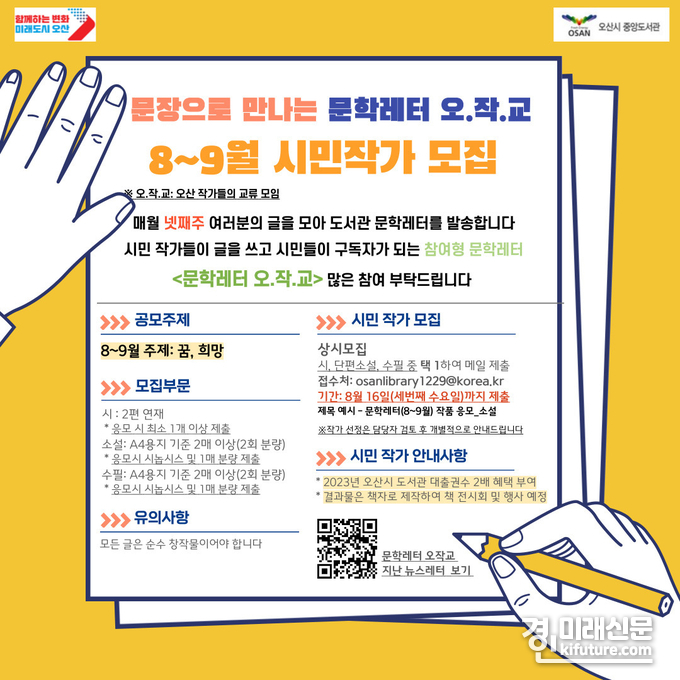 (경인미래신문=민경호 기자) 오산시 중앙도서관은 시민들이 쓴 글을 매달 2회씩 발송하는 간행물(뉴스레터), ‘문학레터 오·작·교’에 참여할 시민 작가를 오는 16일까지 모집한다.