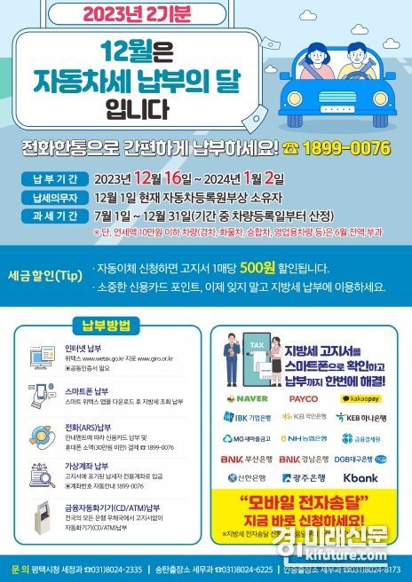 (경인미래신문=민경호 기자) 평택시가 2023년 12월 정기분 자동차세 15만 6000건에 대해 194억 원을 부과·고지하고 납부 기한 내에 납부하도록 적극 홍보에 나섰다.