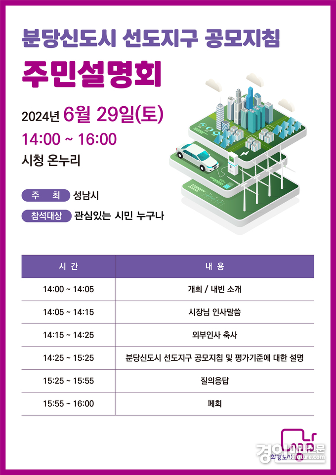 (경인미래신문=민경호 기자) 성남시(시장 신상진)가 오는 29일 오후 2시~4시 시청 1층 온누리에서 분당신도시 선도지구 공모지침에 대한 주민설명회를 개최한다.