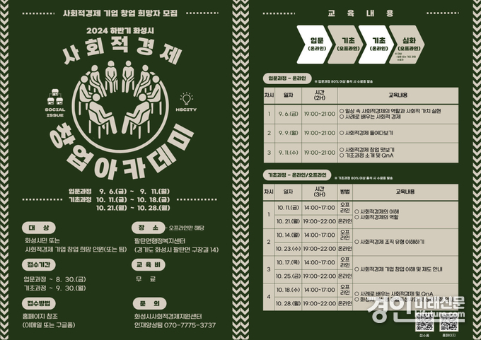 (경인미래신문=민경호 기자) 화성시(시장 정명근)가 2024년 하반기 화성시 사회적경제 창업아카데미 입문·창업 기초과정 수강생을 모집한다.