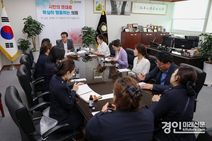 (경인미래신문=민경호 기자) 오산시의회(의장 이상복)는 20일 정혜경 신임 오산경찰서 녹색어머니연합회장을 비롯한 임원단의 예방을 받고 신임회장 취임 인사와 단체 현안과 애로사항을 청취했다.