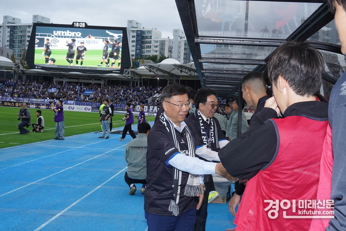 (경인미래신문=민경호 기자) 성남시장은 12일 탄천종합운동장에서 열린 ‘2025 하나은행 K리그2’ 제34라운드 성남FC 홈경기를 찾아 선수단을 격려했다.