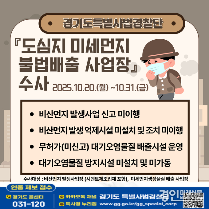 (경인미래신문=민경호 기자) 경기도 특별사법경찰단은 오는 20일부터 31일까지 2주간, 도심지 내 미세먼지 주요 발생 사업장을 대상으로 불법행위를 집중 수사한다.