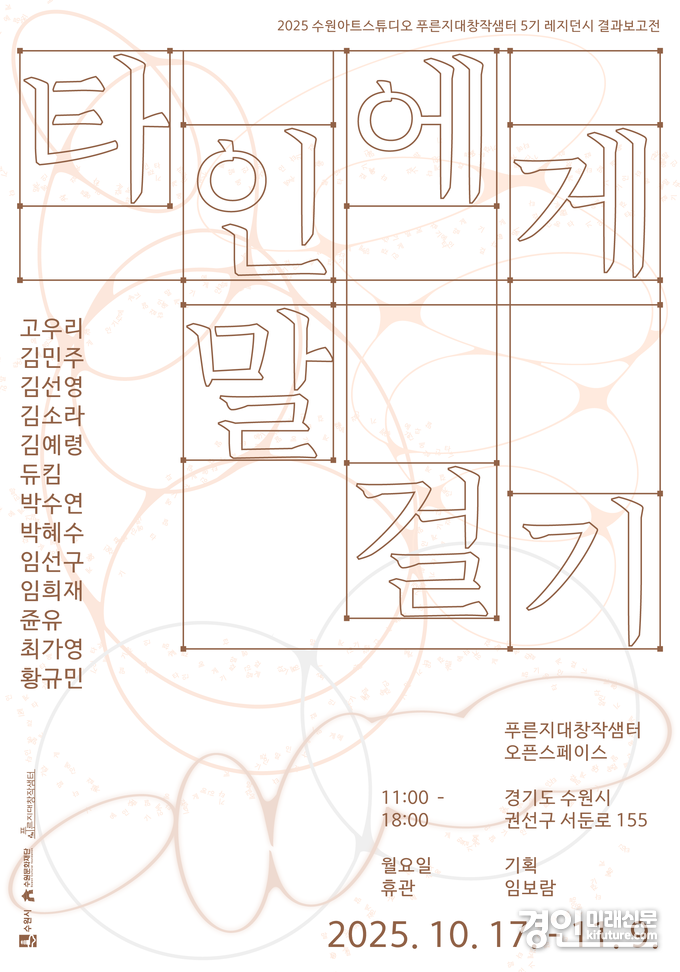 (경인미래신문=민경호 기자) 수원문화재단은 오는 17일부터 11월 9일까지 약 3주간 탑동 시민농장에 자리한 수원아트스튜디오 푸른지대창작샘터에서 5기 레지던시 참여작가 13인의 올 한 해 작품 활동 성과를 공유하는 결과보고전 '타인에게 말 걸기'를 개최한다.