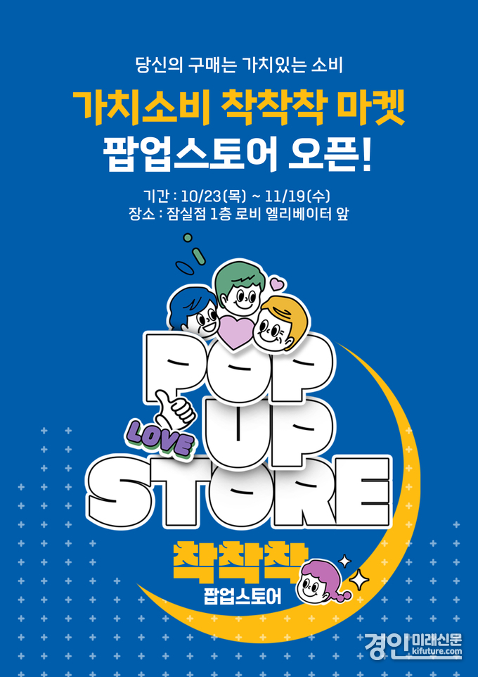 (경인미래신문=민경호 기자) 경기도와 경기도주식회사가 운영하는 경기도 공동브랜드 ‘착착착’이 오는 11월 19일까지 4주간(휴점일 제외) 롯데마트 잠실점 1층 행사장에서 ‘가치소비 착착착 마켓’ 팝업행사로 소비자를 찾아간다.