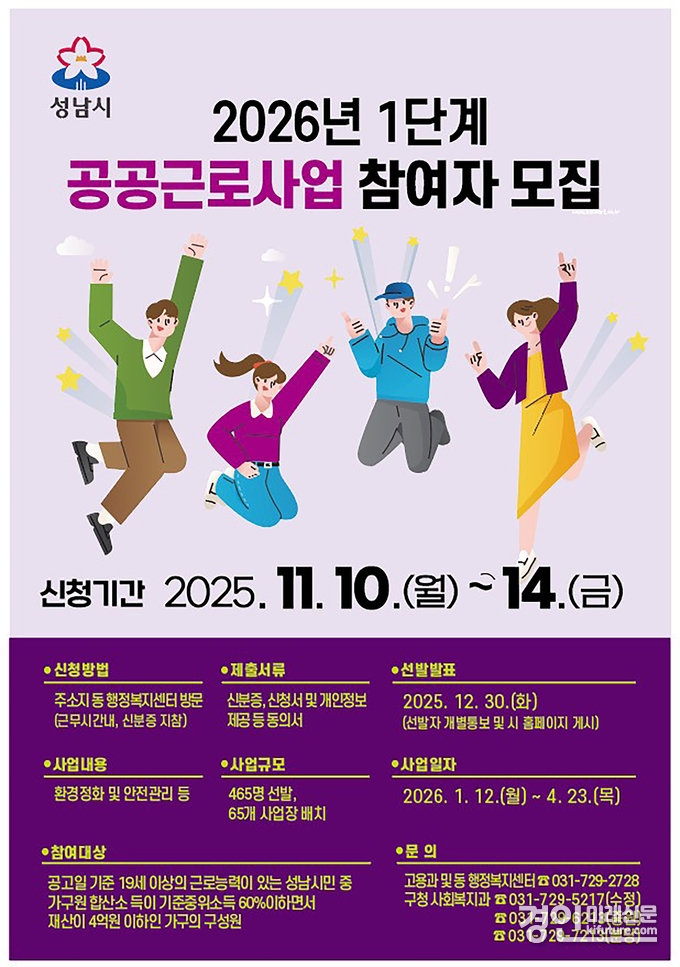 (경인미래신문=민경호 기자) 성남시(시장 신상진)는 오는 11월 10일부터 14일까지 ‘2026년도 1단계 공공근로사업’ 참여 희망자 465명을 모집한다.