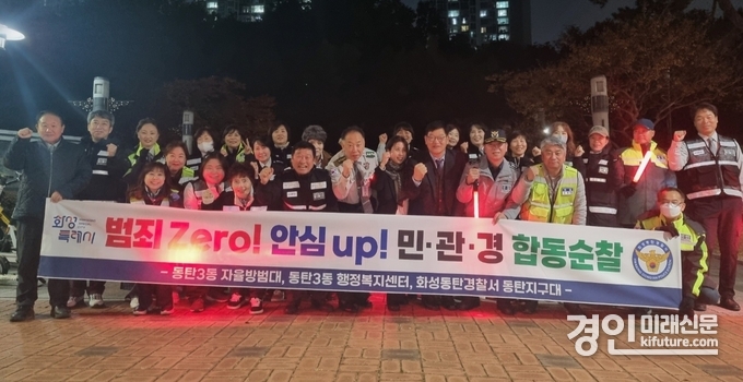 (경인미래신문=민경호 기자) 화성특례시(시장 정명근) 동탄3동이 지난 5일 지역 안전망을 강화하고 범죄 취약지역을 더욱 촘촘히 살피기 위한 야간 순찰 활동을 실시했다.