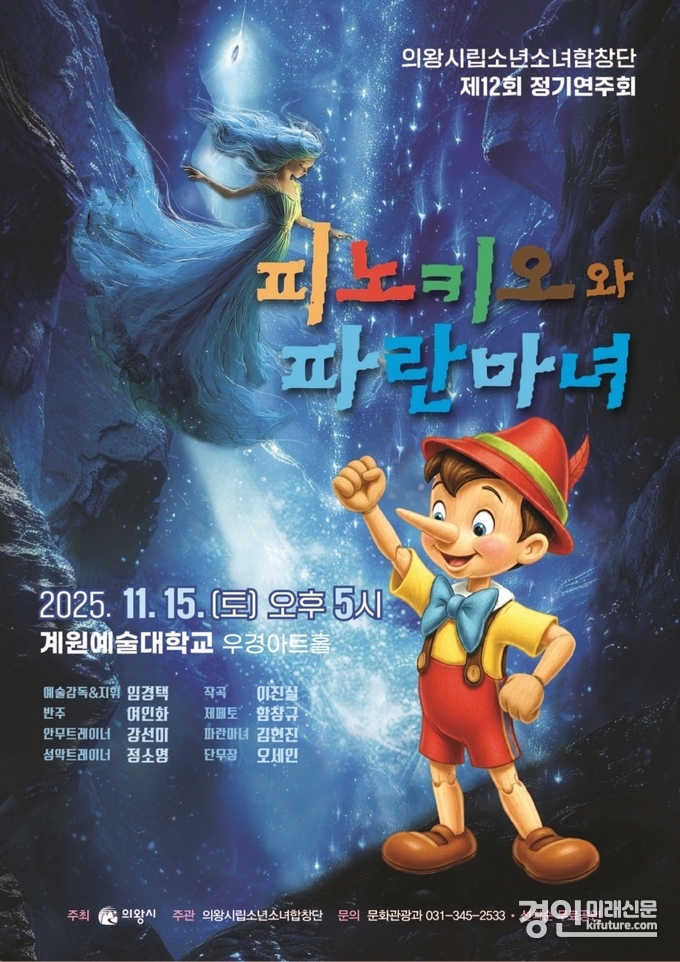 (경인미래신문=민경호 기자) 의왕시(시장 김성제)가 주최하고 의왕시립소년소녀합창단이 주관하는 제12회 정기연주회 '피노키오와 파란마녀'가 오는 15일 오후 5시 우경아트홀에서 개최된다.