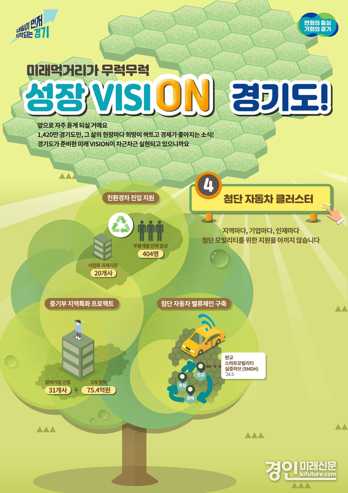 (경인미래신문=민경호 기자) 경기도가 화성과 평택, 성남 판교를 중심으로 첨단 자동차(모빌리티) 클러스터를 육성하며 미래 먹거리 창출에 힘쓰고 있다.