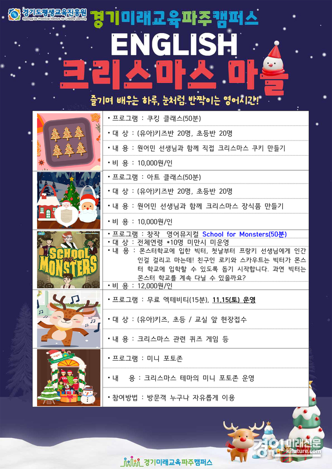 (경인미래신문=민경호 기자) 경기도평생교육진흥원 경기미래교육파주캠퍼스(구 파주영어마을)가 다가오는 크리스마스를 맞아 어린이들의 글로벌 감각을 키울 수 있는 특별 영어체험 프로그램을 운영한다.