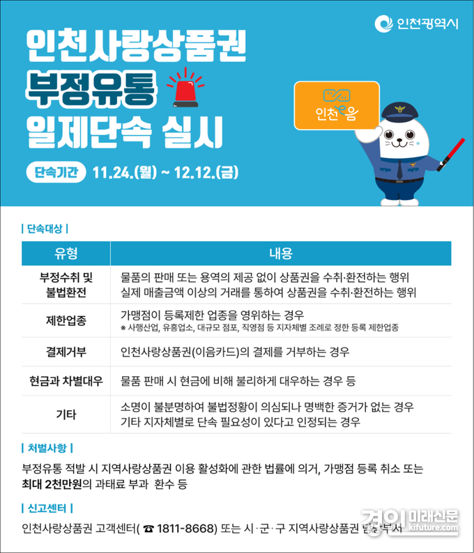 (경인미래신문=민경호 기자) 인천광역시(시장 유정복)는 11월 24일부터 12월 12일까지 인천사랑상품권의 부정 유통을 방지하고 건전한 유통 질서를 확립하기 위해 일제 단속을 실시한다고 밝혔다.