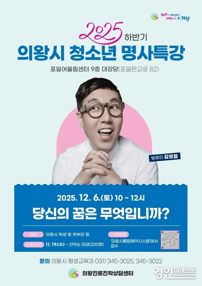 (경인미래신문=민경호 기자) 의왕시(시장 김성제) 진로진학상담센터는 관내 학생 및 학부모 등 200여 명을 대상으로 오는 12월 6일 의왕시 포일어울림센터 9층 대강당에서 ‘2025 하반기 의왕시 청소년 명사 특강’을 개최한다고 밝혔다.