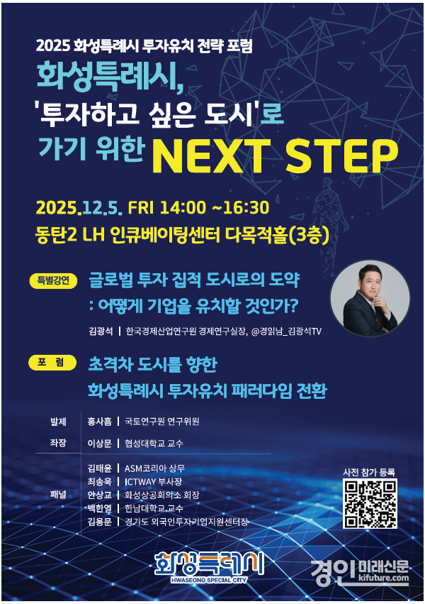 (경인미래신문=민경호 기자) 화성특례시(시장 정명근)가 ‘2025 화성특례시 투자유치 전략 포럼’을 다음 달 5일 동탄2 인큐베이팅센터 다목적홀에서 개최한다.