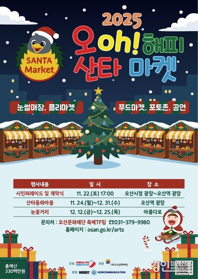 (경인미래신문=민경호 기자) 오산시(시장 이권재)가 주최하고 (재)오산문화재단이 주관하는 오산시 대표 겨울 축제 ‘2025 오(Oh)! 해피산타마켓’이 오는 22일부터 12월 31일까지 오산역광장과 아름다로 상권 일대에서 열린다.