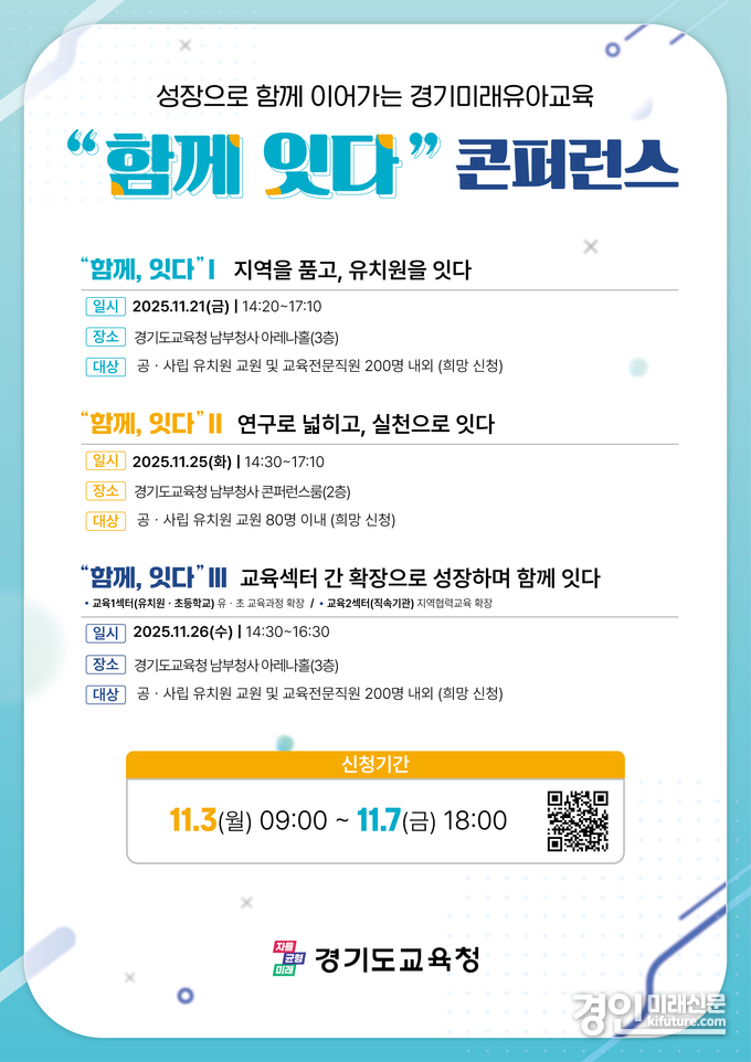 (경인미래신문=민경호 기자) 경기도교육청(교육감 임태희)이 ‘성장으로 함께, 경기미래 유아교육과 함께 잇다’를 주제로 2025 경기미래 유아교육 콘퍼런스를 개최한다.