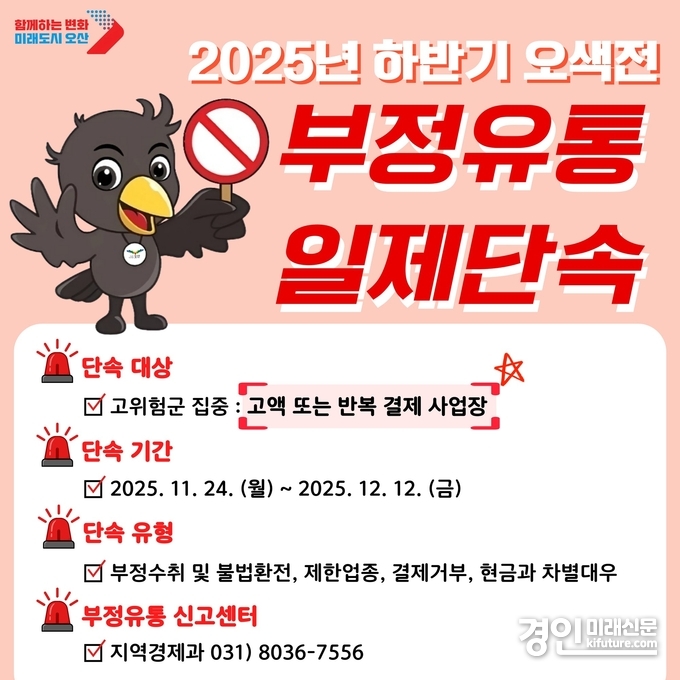 (경인미래신문=민경호 기자) 오산시(시장 이권재)는 지역화폐 ‘오색전’의 건전한 유통 질서 확립과 지역경제 보호를 위해 2025년 11월 24일부터 12월 12일까지 부정유통 행위 집중 단속을 실시한다고 밝혔다.