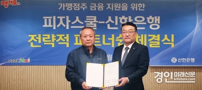 (경인미래신문=민경호 기자) 신한은행(은행장 정상혁)은 지난 25일 서울시 강남구 소재 ㈜피자스쿨 본사에서 국내 최다 피자 가맹점을 보유한 ㈜피자스쿨(대표 유혜미)과 ‘땡겨요’ 플랫폼 가맹점 입점 확대 및 가맹점주 대상 금융 지원을 위한 업무협약을 체결했다.