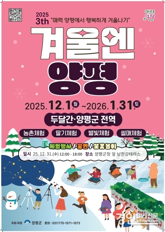 (경인미래신문=민경호 기자) 양평군(군수 전진선)은 오는 12월부터 내년 1월까지 두 달간 다양한 체험과 이벤트가 마련된 겨울 축제 ‘겨울엔 양평’을 개최한다고 밝혔다.