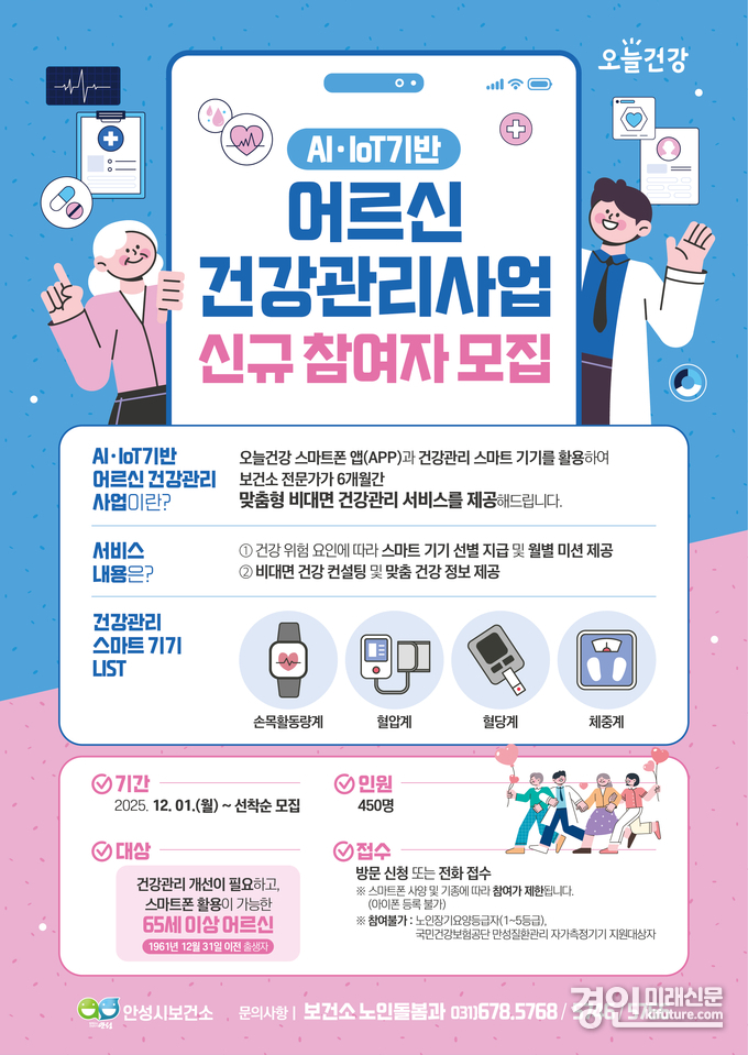 (경인미래신문=민경호 기자) 안성시보건소가 오는 12월 1일부터 2026년도 AI·IoT기반 노인 건강관리 사업의 참여자 450명을 신규 모집한다고 밝혔다.
