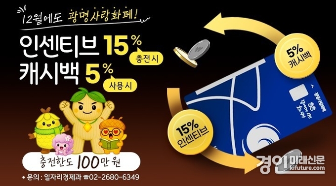 (경인미래신문=민경호 기자) 광명시(시장 박승원)가 지역경제 활성화를 위해 연말까지 광명사랑화폐 인센티브 15%와 캐시백 5% 지원을 이어간다고 28일 밝혔다.