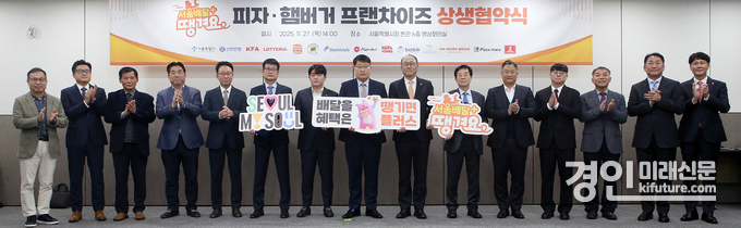(경인미래신문=민경호 기자) 신한은행(은행장 정상혁)은 지난 27일 서울시 중구 서울시청에서 서울시(시장 오세훈), 한국프랜차이즈산업협회(회장 정현식) 및 11개 피자 햄버거 프랜차이즈와 ‘서울배달플러스 땡겨요 활성화를 위한 피자·햄버거 프랜차이즈 상생 협약’을 체결했다.
