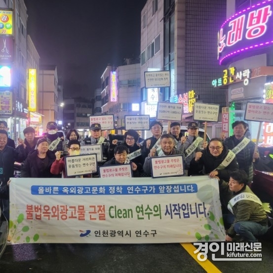 (경인미래신문=민경호 기자) 인천 연수구(구청장 이재호)는 지난 27일 무분별하게 설치되어 도시미관을 저해하고 주민과 방문객들의 불편 민원을 해소하기 위해 연수 1단지 상가 밀집 지역에서 불법 광고물 민·관·경 합동단속을 실시했다.