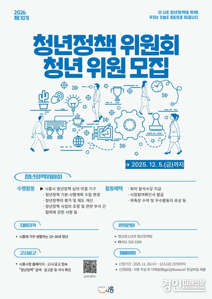 (경인미래신문=민경호 기자) 시흥시(시장 임병택)는 청년들의 다양한 목소리를 들을 수 있는 제10기 시흥시 청년정책위원회 청년위원을 오는 5일까지 공개 모집한다.