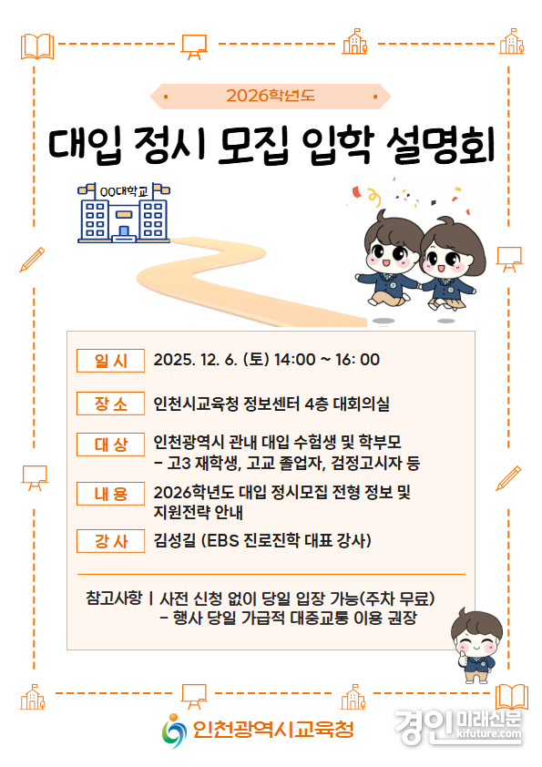 (경인미래신문=민경호 기자) 인천광역시교육감(교육감 도성훈)은 오는 6일 관내 대입 수험생과 학부모를 대상으로 2026학년도 대입 정시모집 입학설명회를 실시한다.