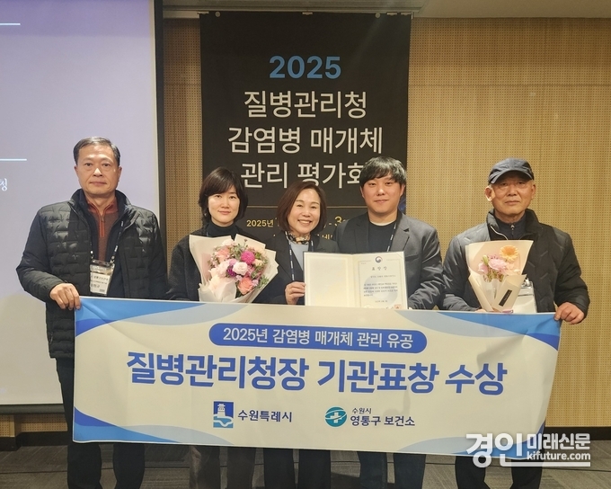 (경인미래신문=민경호 기자) 수원시 영통구보건소가 질병관리청 주관 ‘2025년 감염병 매개체 관리 평가회’에서 감염병 매개체 방제 유공 부문 질병관리청장상을 받았다. 평가회는 2일 수원컨벤션센터에서 열렸다.