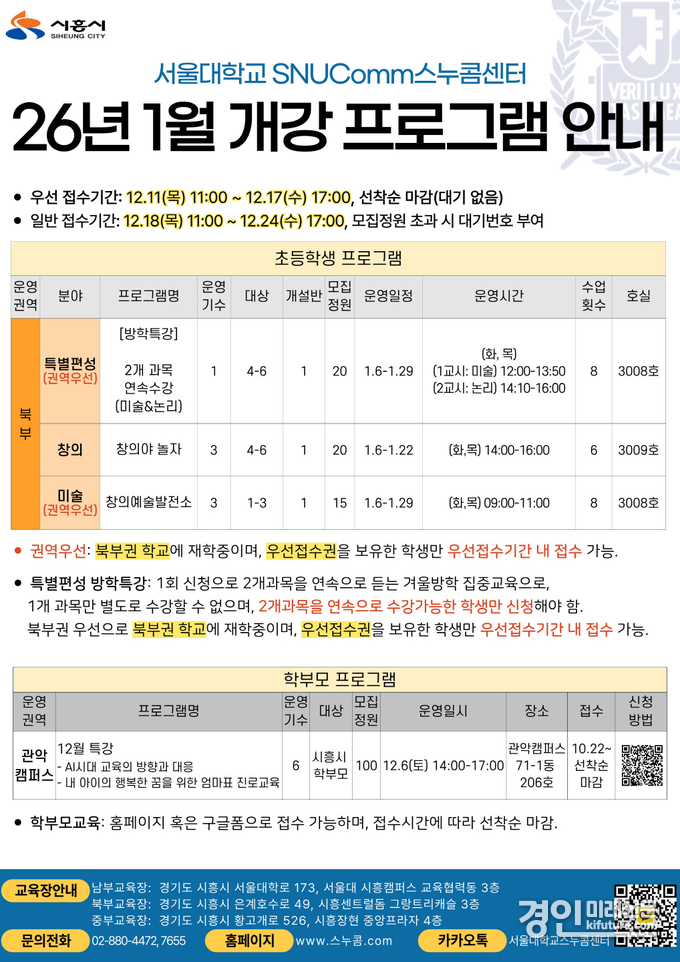 (경인미래신문=민경호 기자) 시흥시(시장 임병택)와 서울대학교의 교육협력사업으로 추진 중인 ‘스누콤(SNUComm)’이 겨울방학을 맞아 초등학교 4~6학년을 대상으로 ‘방학 특강’ 프로그램을 운영한다.