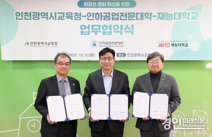 (경인미래신문=민경호 기자) 인천광역시교육청(교육감 도성훈)은 지난 9일 인하공업전문대학(총장 김성찬), 재능대학교(총장 이남식)와 읽걷쓰 문화 확산을 위한 업무 협약을 체결했다.