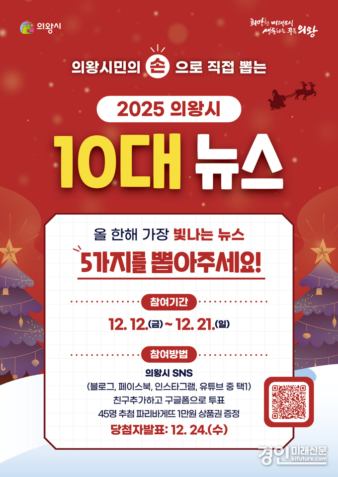 시에서는 득표수가 높은 10건의 뉴스를 ‘2025년 의왕시 10대뉴스’로 선정해 이달 말 시 홈페이지 등을 통해 결과를 발표할 예정이다.