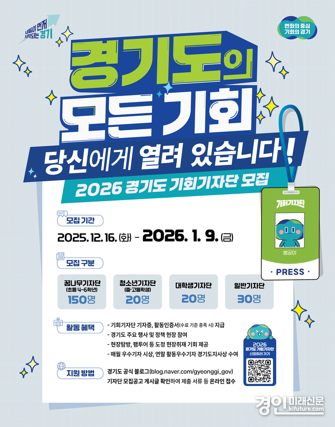 (경인미래신문=민경호 기자) 경기도는 도민이 직접 도정 가치와 주요 정책, 다양한 지역 소식을 취재하고 기사로 전하는 ‘2026 경기도 기회기자단’을 16일부터 2026년 1월 9일까지 모집한다.