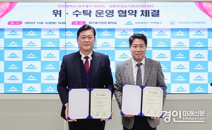 (경인미래신문=민경호 기자) 인천 미추홀구(구청장 이영훈)는 지난 16일 구청장실에서 인하대학교 산학협력단(단장 김동욱)과 미추홀구 어린이·사회복지급식관리지원센터(이하 센터) 위수탁 운영 협약을 체결했다.