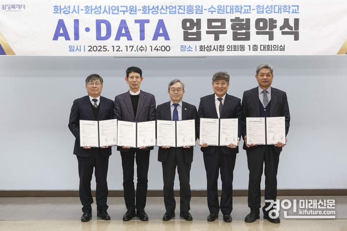 (경인미래신문=민경호 기자) 화성특례시(시장 정명근)는 지난 17일 화성시의회 대회의실에서 화성시연구원(이하 연구원), 화성산업진흥원(이하 진흥원), 수원대학교, 협성대학교와 ‘AI·데이터 기반 관·학·연 협력 생태계 조성을 위한 업무협약’을 체결했다.