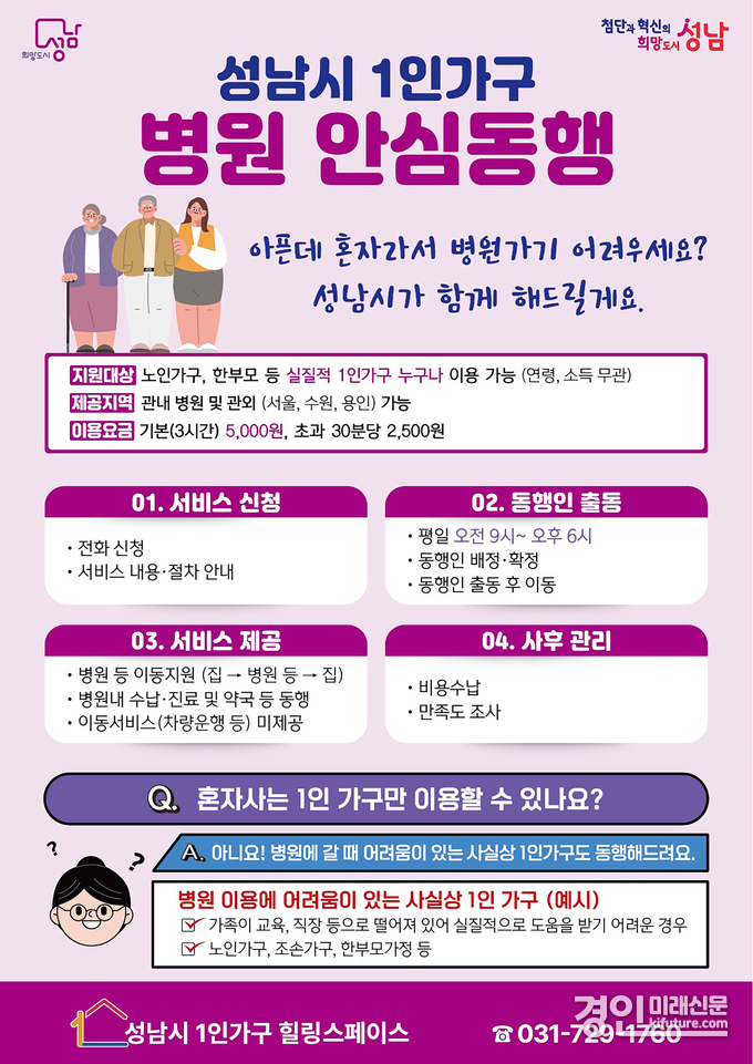 (경인미래신문=민경호 기자) 성남시는 ‘1인 가구 병원 안심 동행 서비스’ 추진을 위해 전문 인력을 기존 4명에서 5명으로 늘렸다고 22일 밝혔다.