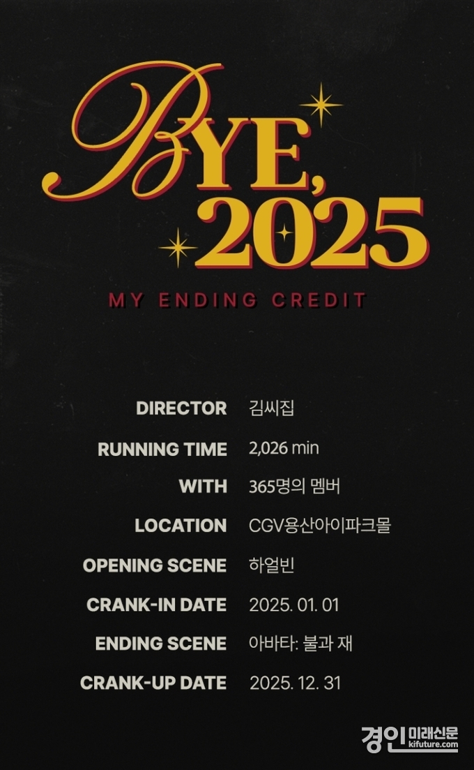 (경인미래신문=민경호 기자) CGV가 연말을 맞아 관객 개개인의 한 해 영화 관람 기록을 돌아보는 특별한 이벤트 ‘MY ENDING CREDIT(마이 엔딩 크레딧)’을 이듬해 1월 4일까지 진행한다고 25일 밝혔다.