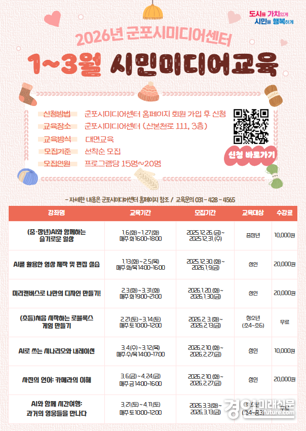 (경인미래신문=민경호 기자) 군포시미디어센터는 시민들의 미디어 활용 역량 강화를 위해 2026년 1분기 미디어교육 프로그램 수강생을 모집한다.